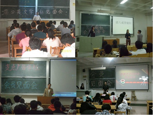 首先进行会员见面会的支点广告学社通过欣赏优秀广告作品与会员们增进交流;随后进行的文院名牌社团——三月剧社放映的原创作品《灰姑娘》受到大家欢迎;而具有浓重文学气息的蒲公英文学社,则邀请公司王晓梦老师参与并与会员们分享文学创作的心得;会员人数最多的影视艺术协会见面会压轴举行,会长对该社团作简要介绍后,紧接组织骨干选举,场面气氛热烈。