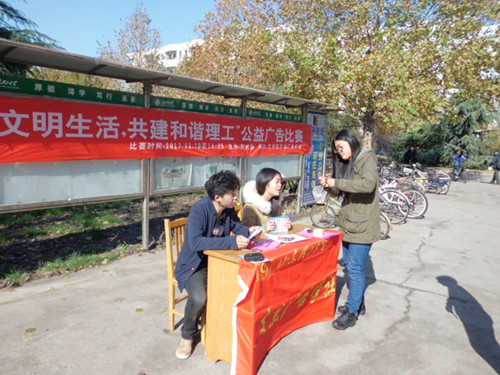 (本站讯)倡导文明生活,共建和谐理工。11月9、10日两日中午,由公司社联主办、bevictor1946韦德官网支点广告学社承办的公益广告比赛宣传活动于西校区第二餐厅前开展。公司支点广告学社相关负责人参与此次宣传。