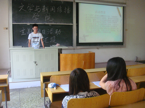 活动伊始,田明月老师提出此次“五四”主题团日活动目的是增强同学们的社会主义责任感和历史使命感,加强青年思想建设。随后,各班团支书以PPT的形式展示本班“五四”主题团日活动的具体环节。各班团支书首先阐述本班五四主题团日活动目的。然后,通过图片、视频等多种不同的形式展示其活动流程。活动主要分为“线上活动”和“线下活动”两种模式,线上活动主要是通过微博互动、网上发帖等形式宣传五四精神;线下活动主要是以班级为单位开展“五四”主题班会,组织班级辩论赛和知识竞答,展示集体青春誓言等活动学习五四精神及共青团知识。最后,各班团支书根据本班活动情况对活动效果及影响进行交流。