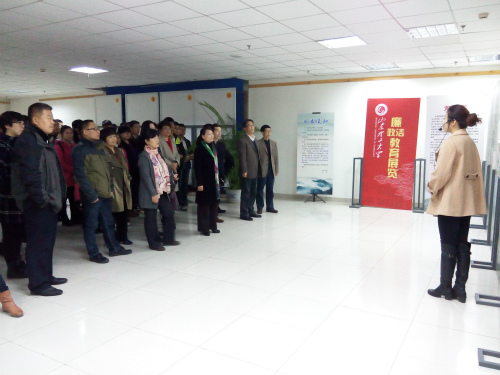 在讲解员的带领下,一行人参观了展览的五个部分。在第一部分“中国历史中的廉政文化借鉴”中。从思想、制度、实践等几个方面对中国历史中的廉政文化进行了总结,阐释了“廉”、“廉洁”、“廉政”三个概念。在第二部分“中国共产党的拒腐防变风雨路”中,介绍了党从中国共产党成立至十八大以来在廉政建设中所做的努力,并对反腐倡廉之路进行了梳理。在第三部分“警钟长鸣,防微杜渐”中,用反面典例敲响了警钟,展示党中央“老虎”、“苍蝇”一起打的反腐决心。在第四部分“当代典范,身边榜样”中,详细介绍了清正廉洁、作风过硬、恪尽职守的模范党员,学习了钱学森、郑培民、郭明义等人的光辉事迹。在最后一个部分“廉洁修身,从我做起”中,分别对党员领导干部、广大人民教师、青年员工提出了要求,要常修为政之德,要有理想信念、道德情操,要勤学、修德、明辨、笃实。