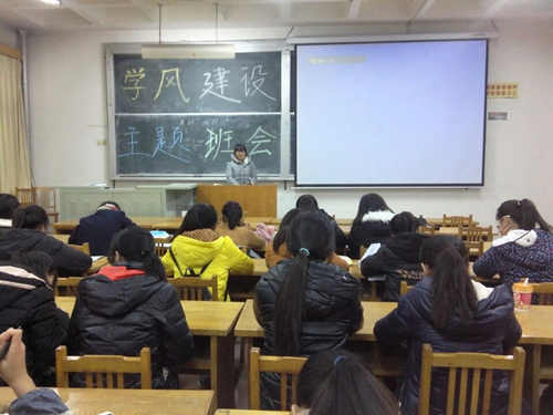 (本站讯)为了加强学风建设,帮助员工养成良好的学习习惯,12月10日晚,14级汉语言文学(师范类)专业组织了“良好学风 诚信先行”学风建设主题班会,于2号教学楼204教室举行。辅导员张健及中教两班全体员工参加。