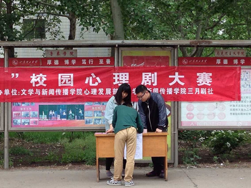 在宣传现场,活动相关负责人员借助悬挂条幅、分发宣传单页等方式进行宣传。许多同学上前认真仔细地询问此次心理剧比赛的相关内容,表现出对此次活动的高涨热情。在场的负责人员则对同学们的提问一一进行认真的解答,尽心尽力对同学们的疑问报之以满意的答复,详细地向同学们介绍此次剧本征集大赛的作品要求、报名方式、评分细则等相关事宜。此次活动的现场宣传使更多的同学对此次剧本征集大赛有了深入了解,很多同学踊跃报名参加,宣传单页更是在短短的时间内被“一抢而空”。