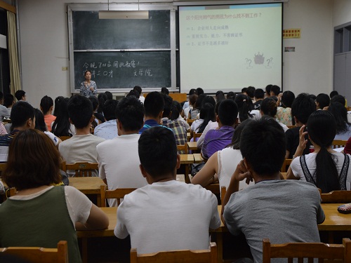 培训还未开始,来自不同公司的同学们早已来到教室等候,显示出同学们高涨的学习热情。活动伊始,王艺玲强调了口才在人际交往中的重要性,并结合精彩的PPT演示,提纲挈领地向同学们展现了口才的艺术魅力。她提到:“何为语文?口头为语,书面为文。”指出学习语文既要提高口头表达能力,又要提高书面表达能力。随后,王艺玲从即兴表达、朗诵演讲、普通话、台上礼仪等方面给了大家一些有益指导。王艺玲非常注重与同学们的交流互动,邀请同学上台进行自我介绍,并指出其需要注意的地方。大家踊跃发言,积极配合,整个培训过程气氛活跃。