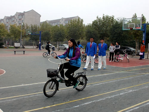虽然天气有些微凉,但老师们的比赛热情丝毫未减。比赛还未开始,张健老师就已经到达比赛场地,骑上已准备好的自行车进行赛前练习,还不时的同其他老师进行技术和经验上的交流,赛前准备活动进行的井井有条、从容不迫。随着裁判员一声令下,比赛正式开始,张健老师轻蹬脚踏板儿,同时尽力掌握着身体的平衡,整个过程十分紧张,张健老师也一直认真谨慎,眼睛始终注视前方,以最慢的速度骑行着。最终,张健老师凭借着1分31秒的时间取得第六名的好成绩。