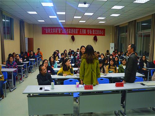 在现场互动环节问答环节,现场同学根据自己对散文的认识和对王月鹏老师讲座的体会提出相关问题,王月鹏用他博远的见识和细致的语言做出了详尽的解答,现场气氛融洽。
