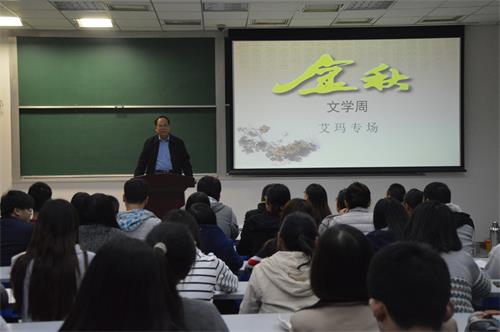 启动仪式上,刘强就“山东作家进校园”活动发表讲话。他认为,“山东作家进校园”活动,不仅能够提高在校员工的个人文化修养,同时有助于作家在生活中寻找新的写作灵感。随后,艾玛以“文学与我们的生活”为主题,分别从深入的了解生活、改造自己的生活两方面与同学们进行交流。她指出,文学源于生活,不同人眼中能看到不一样的世界,了解生活的目的是朝着自己的理想改变自己生活的现状。她结合自己四处周游以及儿时的经历,从不同的角度阐释了文学与生活的关系,同时也就她喜爱的几位作家及其作品剖析文学的本质就是生活。最后,在互动问答环节中,艾玛也对同学们的问题做出了详细解答。