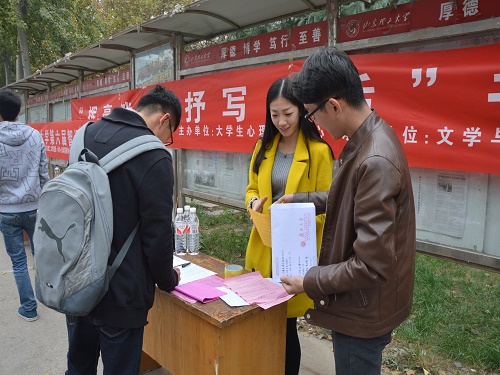 活动相关负责人员认真布置宣传现场,通过悬挂条幅、分发单页等方式积极宣传,引来众多学子驻足围观。在场负责人悉心介绍书法大赛相关内容:比赛形式分为硬笔字和软笔字比赛,楷书、行书、隶书自选一种。作品主题不得脱离心理教育“快乐学习·健康生活”的主题。对于同学们的疑问,社团成员耐心解答,同学们表现出浓厚兴趣,纷纷热情报名,现场气氛活跃。经过两天的积极宣传,报名参赛人数已达数百人。据悉,“挥毫泼墨·抒写生活”书法大赛于11月14日和26日分为初赛和决赛进行,共产生一等奖一名、二等奖二名、三等奖三名。
