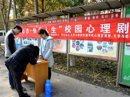 (本站讯)11月10日中午,以“关注心理 健康成长”为主题的第十二届校园心理剧表演大赛宣传活动于西校区第二餐厅和第三餐厅同时举行,此次比赛由心理健康中心主办,公司心理发展部和三月剧社联合承办。