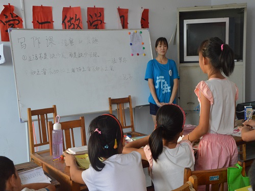 写作课之前,张金秀带领孩子们学习每日的固定课程——论语。“子曰:‘饭疏食饮水,曲肱而枕之,乐亦在其中矣。不义而富且贵,于我如浮云’。”朗朗的读书声传达出孩子们对知识的渴求。片刻休息后,写作课正式开始。张金秀从法国著名雕塑家罗丹的名言——“生活不是缺少美,而是缺少发现”讲起,启发孩子们写作要用心观察,并通过展开“说出你认为我们这个村子里最美丽的地方”话题,引导孩子们畅所欲言,锻炼提高口语表达能力。她讲道,观察是认识世界,积累写作素材的重要途径,同学们要养成仔细观察的良好习惯。随后,张金秀为孩子们讲述了《大乌龟》的故事,让孩子们写一篇读后感作为作业,可以谈及自己喜欢的故事人物以及原因。而后,张金秀引用《论语》中的“知之者不如好之者,好之者不如乐之者”,阐述了兴趣对于写作的重要性。最后,张金秀为孩子们提出了“写日记、多阅读”等写作建议,不知不觉中,课程在愉快的氛围中结束。
