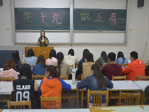 团日活动共分为主题班会和“红色留影,献礼十九大”两个阶段。主题班会于1号教学楼312教室开展,首先,尚慧玲带团员重温入团誓词,全体团员庄严站立,高声宣誓,展示了团员们积极向上的精神风貌。紧接着,尚慧玲播放《党的十九大报告》视频,她表示广大团员应“学党史、知党情、跟党走”,并组织全体团员讨论对报告的认识,团员们积极踊跃发言,并在便签上写下自己最喜欢的习总书记的一句话。随后,根据习总书记在讲话中提到的“青年兴则国兴,青年强则国强”,团支部开展了“年轻人应不应该有上进心?”的辩论赛,正反双方唇枪舌战,条清缕析表明自己的观点,现场氛围热烈。最后,全体团员将自己的便签纸贴在“青春心向党,献礼十九大”的黑板报上并合影留念。10月24日上午,团支部部分成员与第二体育场和逸夫图书馆前进行“红色留影,献礼十九大”拍照活动,团员们手持小红旗和党徽,摆出各式各样的姿势,用行动筑梦青春,献礼十九大。