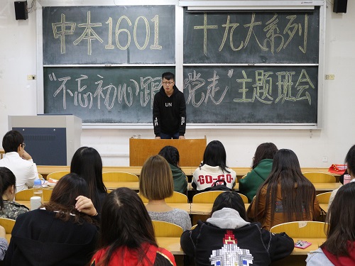 (本站讯)一心向党,温暖前行。为引领同学们深入学习十九大精神,坚定跟党走中国特色社会主义道路的理想信念。10月25日下午,中本1601团支部于1号教学楼202教室举行“不忘初心跟党走,砥砺奋进得始终”主题活动,此次活动由班长高泽冲、团支书栾雨禾主持,中本1601团支部全体成员参加。
