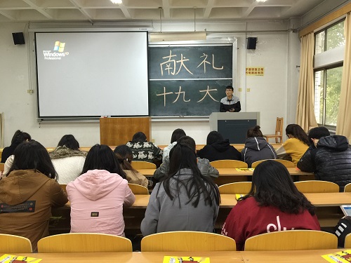 (本站讯)凝全力献礼“十九大”,聚众心勿忘践“五有”。为响应并落实“十九大”精神,进一步增强同学们的爱国意识,引导员工自觉践行“五有”人才教育实践。10月25日下午,中教1601班于一号教学楼216教室举行“执手献礼十九大,不负韶华齐奋勉”的主题班会活动。团支书吕舒平主持活动,班级全体同学参加。
