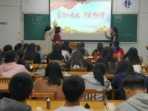 (本站讯)青年有梦想,国家有希望。为贯彻中国特色社会主义精神,庆祝中国共产党十九大的顺利召开,使十九大主题深入人心。10月25日晚,2017级广告学专业“喜迎十九大”团日活动于东校区第3教学楼405教室举行,广告1701班团支书王帅和广告1702班团支书马长超组织活动,2017级广告学团支部全体成员参与。