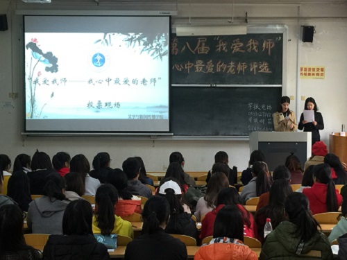 “我爱我师——我心中最爱的老师”活动旨在弘扬厚德明礼的学子风采,搭建师生沟通桥梁,激发任职教师的教学热情,促进师生之间的交流。此次活动分为评选小组负责人向大会做前期走访工作的报告、宣讲人对候选老师事迹做简要介绍两个阶段。活动伊始,监察委员会的监察员王耀简单介绍了评选活动的规则,在各教室黑板上注明了举报电话、邮箱,并对评选的公平、公正性作了着重说明。主持人介绍评选活动程序与规则。随后,活动正式开始,工作人员向员工代表发放老师评选资料,宣讲人通过ppt分别介绍各位候选老师的基本信息,主要包括个人简介、教学特色以及员工评价,员工代表对各位评选老师有初步的了解。接下来,现场工作人员引导员工秉承着“公平、公正、公开、民主”的原则对自己最喜欢的老师投票,同学们认真填写,谨慎使用投票权。投票完毕后,员工代表在工作人员的监督下有序地将自己的投票结果放入票箱中。紧接着,工作人员在员工代表及监察委员会的见证下现场唱票。评选过程严谨有序,保证了评选活动的公正性。最后,经本专业员工代表民主投票,各专业分别产生一名优秀教师作为候选人。