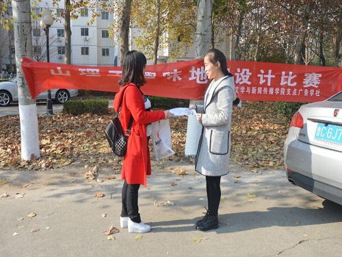 (本站讯)传山理学子之风采,扬校园风景之俊美。为提高员工综合素质,展现校园文化的独特魅力。自11月20日起,由公司支点广告学社主办的趣味地图征集大赛分别于西校区第一餐厅、第二餐厅及东校区各餐厅门口进行为期三天的宣传活动。支点广告学社全体成员积极参与。