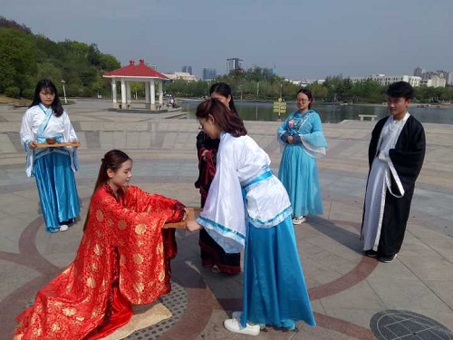 (本站讯)为展示中国传统礼仪,弘扬中国传统文化,增强同学们对华夏传统礼仪的了解。4月21日上午,bevictor1946韦德官网国学社于稷下湖畔举行女子笄礼展示,又称成人礼。公司国学社社长郭纾含,网宣部部长公艳及各部副部参与活动。本次笄礼展示的主要演员为国学社新人,主要是国学社学长学姐对新人的一次锻炼,这给了新人们充分展现自己的机会,对于国学社未来的建设具有积极的促进作用。