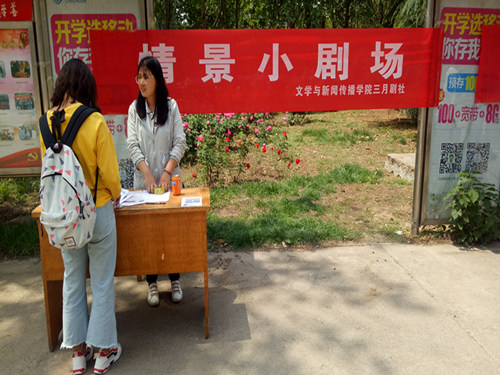 (本站讯)温暖五月,释放激情。5月7日,由三月剧社举办的“情景小剧场”宣传活动在第一餐厅、第二餐厅及东校区各餐厅门口举行,三月剧社社长陶娜及全体社员参加此次宣传活动。