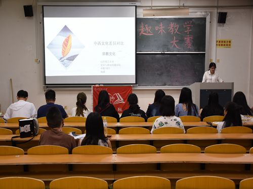 比赛开始前,在初赛中晋级的10组选手们通过抽签选择出场顺序。随后,主持人对比赛规则和流程做简要介绍,并宣布比赛正式开始。紧接着,参赛选手根据抽签顺序依次上台进行课件展示与讲解。选手们借用传统板书、实例分析、交流提问等多元化的方式辅助教学,或声情并茂,或循循善诱,在讲解的同时还不忘与台下观众互动,调动起“趣味课堂”的课堂氛围。同时,她们独到的见解和巧妙的设计更是得到了大家的一致好评,现场气氛推向高潮。其中,陶娜以“宗教文化”为主线,通过多角度的对比,带大家一览中西方文化的差异。安春雪借舒缓动人的古典音乐将大家带入情境,采用提问、引导的方式与观众完美互动,深入浅出地讲解了《江城子·乙卯正月二十日夜记梦》。选手们经过台下精心的准备和台上精彩的发挥为观众们呈现一场知识与学术的盛宴,现场课堂气氛活跃,掌声不断。最后,评委对选手们的表现依次进行点评,比赛在融洽的氛围中结束。