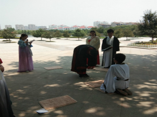 “舞转回红袖,歌愁敛翠钿。满堂开照曜,分座俨婵娟。”此次活动共分为四个部分。活动伊始,首先由国学社及茶艺工作室社员共同表演男子成人冠礼,此次冠礼人员有父母亲,正宾,冠者,赞者及有司。在冠礼开始前,主人立于东面台阶位等候宾客;有司托盘站在西面台阶下;客人立于场地外等候;冠者换好采衣采履安心等候。伴随着音乐演奏,冠礼正式开始,冠者面向来宾,多次谒拜。随后正宾为冠者理装,赞者象征性为冠者正装并高声吟颂祝辞。最后冠者行跪拜礼,表达对父母、师者和长辈的尊敬与爱戴。表演重现了古代男子成人礼现场,有利于增强同学们对华夏传统礼仪的了解。