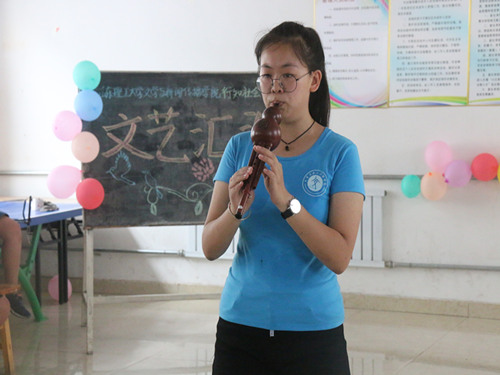 文艺汇演由实践队员和员工们一同表演,涵盖歌曲、舞蹈、葫芦丝、朗诵、历史剧等多种节目类型,其中既有队员们自编自演的原创节目,也有师生温暖的密切合作。与此同时,演出还采用空间直播的方式,使更多人参与到汇演之中。汇演以颇具活力和青春色彩的舞蹈《大家一起来》开场,瞬间点燃起观众的热情。随后,由“行知”社会实践团全体成员带来一首全新改编的《行知的故事》,在优美动人的旋律中深情颂出对东同古村的炽热感情,表达十五天中积聚的点滴感动和即将离去的不舍。经典咏流传中歌曲《读唐诗》和《送别》,意蕴悠远、娓娓道来,跟随历史车轮的轨迹共赏唐诗的韵味,抒发悲喜离合的感慨。传统软笔书法与极富中国古典美的伴舞的结合,在衣袖纷飞、柔荑细软中体悟中华传统文化的魅力,优美典雅、美不胜收,赢得台下长久的掌声和欢呼。