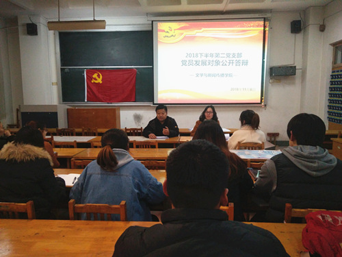 (本站讯)11月8日下午,2018年下半年党员发展对象公开答辩在2号教学楼227教室和1号教学楼321教室顺利进行。此次答辩由员工第一党支部书记刘菲菲、第二党支部书记田明月主持,员工党支部全体党员、党员发展对象、入党积极分子代表和组织员王建利老师参加会议。