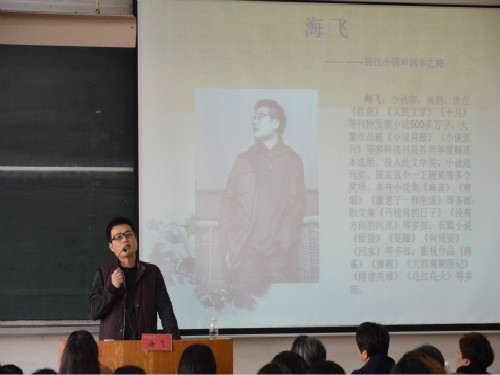 海飞讲到,剧本和小说创作应该突显人性,多层次展现人物形象。他以路遥的小说和影视剧《亮剑》为例,层层剖析,逐渐深入,向大家展现文学作品中呈现出的淳朴的人性之美。他鼓励同学们要坚持写作,勤于思考,从生活中寻找创作灵感。海飞的讲解生动幽默,贴近生活,深深吸引着在场听众。最后,讲座在热烈的掌声中圆满结束。