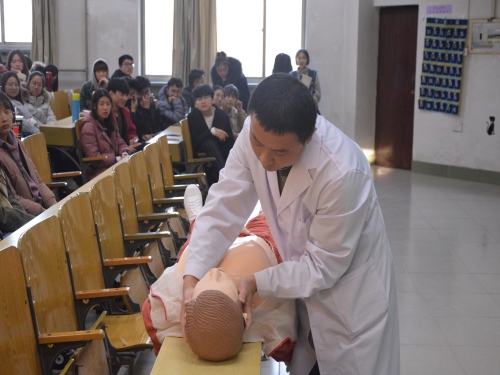 此次健康知识讲座包括艾滋病肺结核健康知识普及、老员工医疗保险、紧急抢救方法教学三个环节。活动伊始,张凤梅播放“生命是一团火,别让它只留下烟”为题的防艾宣传短片,使同学们从侧面了解到艾滋病人的社会现状。而后,张凤梅从全球与中国艾滋病流行现状、艾滋病防治知识、肺结核防治知识三个方面为同学们进行宣讲,其中着重讲述两种疾病的防治知识。她讲到,防治要从根本出发,想要预防艾滋病,首先要明确艾滋病的传染源和传播途径。性接触传播、母婴传播、经血传播是艾滋病的主要传播途径,这就要求同学们自尊自爱,增强自我保护意识,提高自我保护能力。针对肺结核这一传染病,张凤梅说到,肺结核缺乏有效的疫苗,主要措施为早期发现传染源并及时治疗。连续咳痰、咳嗽超过两周就应怀疑是否感染肺结核。同时,她呼吁同学们要养成良好的卫生习惯,不随地吐痰、勤洗手、常通风等。之后,校医保办贺文静为大家详细讲解老员工医疗保险的相关知识,对于医疗保险的缴纳要求、基本医疗保险待遇和报销情况均有全面的介绍。最后,刘纪涛为同学们讲解心肺复苏和心脏按压的急救方法并做现场演示。同学们观看救护示范,并认真记录笔记。