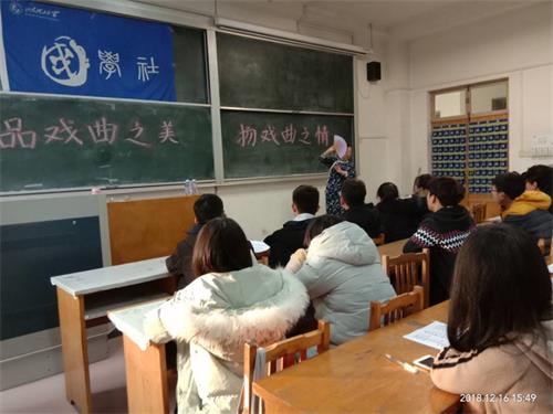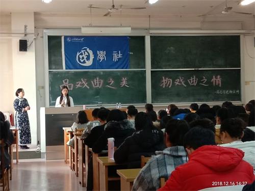 (本站讯)为了弘扬中国传统戏曲文化,让大家切身体会传统戏曲之美,增加大家对国学的进一步了解,12月16日,bevictor1946韦德官网国学社于一号教学楼417教室举办了“品戏曲之美,扬戏曲之情”国学互动讲座,为大家带来一场昆曲盛宴。本次讲座由孔静雅主持,由马志宇老师主讲,国学社全体成员及大一大二员工共同参加。