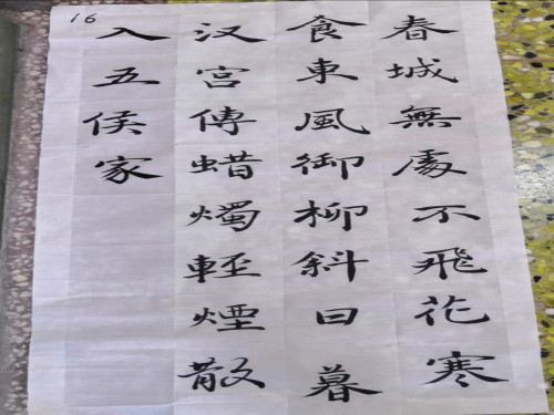 初赛从众多选手中选出10位优秀选手晋级决赛。决赛从十名选手中评出一二三等奖。初赛环节。四十余名选手在宣纸上书写关于春天的诗词。由工作人员将写完的作品展示给两位评委,评委老师现场打分。最后根据分数选出十名优秀选手作品进入决赛。