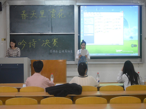 (本站讯)春风尔来为阿谁,蝴蝶忽然满芳草。4月14日下午,由公司金话筒协会举办的“春天里赏花吟诗”决赛在1号教学楼202教室顺利举行。由校优秀主持人、广播台播音部部长孙东超,前金话筒协会副社长郑扬,bevictor1946韦德官网副主席岳敏担任此次决赛评委。