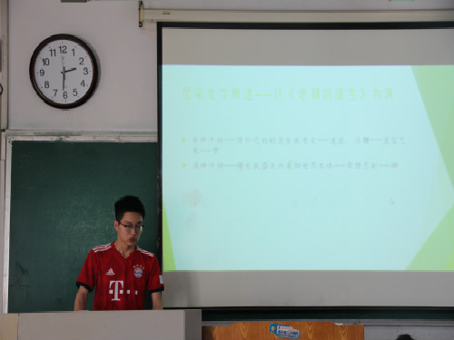 此次讨论会围绕三岛由纪夫的著名作品《金阁寺》展开,以小组成员轮流发言展示的形式进行。小组成员依次上台阐述自己对《金阁寺》的认知与理解,同大家一起分享读完此书的感悟和收获。讨论会伊始,朱军点明此次讨论会的主题,并从感性认识和理性分析两方面提出独到的分析角度。而后,池泉率先发言,他对《金阁寺》理解深刻,并结合其他作品进行拓展延伸,分析透彻,条理清晰。他讲到,尼采的悲剧理论与《金阁寺》的美学理论有相关性。尼采认为悲剧的本质是个体在宿醉状态中打破个体与世界的对立,将小我融入世界大我的悲喜中。而《金阁寺》贯穿了三岛由纪夫一贯的美学理念,认为绝美的事物只存在于毁灭这一形式中;而沟口通过毁灭金阁这一行为,打破了自己与美之间的对立,且在毁灭中感受到自身的官能美,达到了生命力的满溢。王采玉则结合三岛由纪夫自身不幸的幼年经历,分析认为这部作品是主人公自我出走又归来,从世界回到自我的过程。之后,公颖分享自己的见解,她讲到,此部作品语言优美,色彩鲜明,将哲学和美学相融合,形成一个美丽的悲剧。刘泽源则对她的观点提出质疑,她认为,金阁寺被烧毁并不能算是一个悲剧,而是一种选择。最后,小组成员就“金阁寺被烧毁是否为悲剧”展开讨论,同学们各抒己见,你来我往,现场气氛活跃热烈。