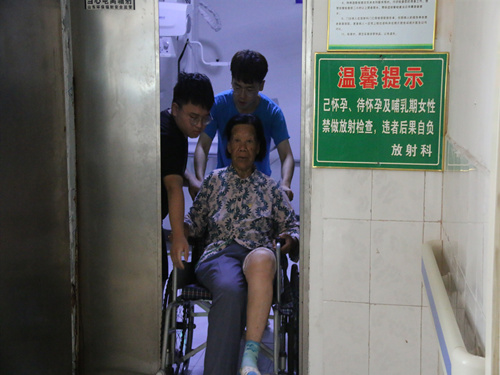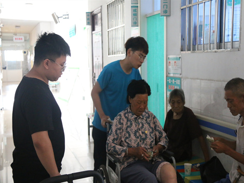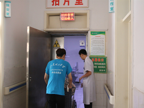 因为两位老人对医院就诊流程不是非常熟悉,队员主动帮忙询问医生,在医生的指导下带着缴费单,帮助老奶奶交放射科拍片的费用。而后,两位同学将单子交给放射科的医生,推着老奶奶进拍片室,进行身体检查。由于老奶奶身体脆弱,腿脚不方便,两位队员配合着医生将老奶奶慢慢的扶上躺板,并和老奶奶的儿子在外面静候。等待过程中,两位队员为缓解老大爷的紧张感,主动与其聊天,转移注意力。灯灭后,两位同学进去帮忙,将老奶奶从板子上扶到了轮椅上,缓缓地推出了拍片室。遵循医嘱,两位同学便与两位老人在医院休息处边聊天边等结果。拿到检查结果后,两位队员帮助老人去拿药,并将医生说明详细地转告给老人。队员们送两位老人坐上回家的车后,继续跟随队伍进行调研。