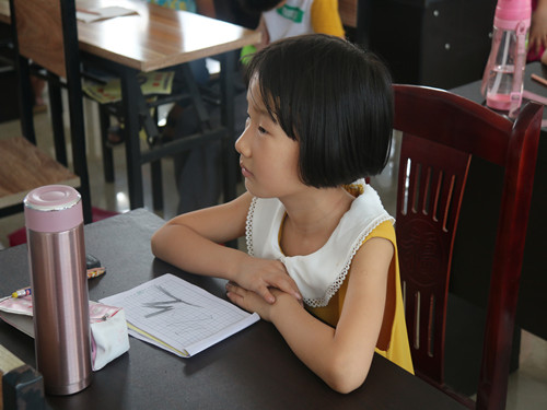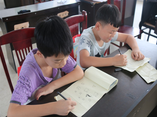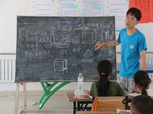 素描作为独特的艺术种类,有其独特的艺术价值。开课之前,韩文杰在黑板上画下正方体、长方体等立体图形并提醒孩子们拿出画笔和画纸,而后正式开始上课。课程内容主要包括素描的含义、基本要素、生活中的几何体例等几个方面。课堂伊始,韩文杰提出问题“同学们知道素描也属于绘画的一部分吗?”通过发问的方式激发同学们的学习兴趣。随后,韩文杰具体教授关于素描的知识。从老师那里同学们了解到,素描有黑、白、灰三个基本元素和近大远小的绘画原理。此外,世界上绝大多数物体都是由正方体、柱体、台体和锥体构成的。在老师的示范引领下,同学们在画纸上尝试着画下正方体、长方体等立体图形。