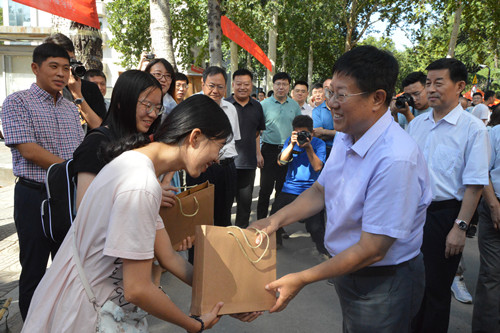 上午10点,党委副书记、董事长张铁柱,党委常委、副董事长王立斌、魏修亭来到东校区迎新现场,检查指导相关公司迎新工作。张铁柱一行与安延和卢俊英亲切交谈,在得知两人的经历后,张董事长希望她们好好珍惜这份缘分和友谊,并勉励她们来到公司后,继续一起成长、一起进步,争取将来一起考上研究生继续深造。随后,张铁柱还为她们送上公司精心准备的纪念品。安廷和卢俊英对董事长的关心和祝福表示感谢,并表示会继续努力将主要精力放在学习上,不辜负老师的期待和四年青春时光。