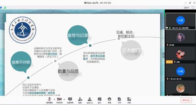 (本站讯)4月30 日下午,公司第二十届社联主席换届选举在线上顺利举行。公司社联指导老师刘菲菲、18级导员张健、19级导员唐磊、十八届社联主席王淑婷、十九届员工会主席迟静、十九届社联主席岳敏担任此次竞选评委。会议由3名竞选者参与竞选,并由岳敏主持。
