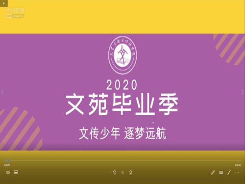 而后,第四个环节——“云合唱·致我们的永恒情谊”悄然而至。随着离别钟声敲响,毕业生们将踏着前进的曙光,追逐美好的梦想。同学们在《当我开始真正爱自己》的诗朗诵中沉默深思,在未来每个人都需要有爱与被爱的能力,学会爱别人也要学会爱自己;在致敬第18届员工会的视频中,复刻了他们在文苑生活学习的日日夜夜,他们用热爱、责任,为文院建设增砖添瓦,我们用心传达对他们的感谢;改编版《共青团路的日子》里歌词记录着从初入大学到走向毕业的匆匆四年,那些熟悉的场景和面孔、那些收藏着的青春纪念,深深触动同学们的回忆。虽即将奔赴未知的远方,我们依然是文传学子,即使往后生活各不相同,也要乐观面对一切。最后,在师生合唱《送别》的歌声中,观众以弹幕形式表达了对毕业生的祝福,至此,线上毕业晚会落下帷幕。