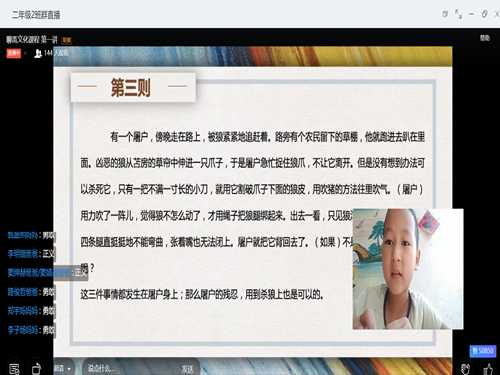 晨占雀喜,夕卜灯花。《聊斋志异》的作者蒲松龄,其故居便坐落在淄博市淄川区洪山镇蒲家庄,所以对同学们来讲,家乡文化的学习必不可少。刘博仁在采访时提到,他并没有专门学习过聊斋文化,于是他先自己广泛搜罗资料进行学习,然后将这些资料整理成课件讲授给小朋友,并希望通过更多趣味的方法让孩子们接受。首先,他细致地为同学们讲解《聊斋志异》的由来以及其艺术成就,并播放视频让同学们了解蒲松龄;其次,他通过呈现蒲松龄故居的一些图片让孩子们进一步走进蒲松龄、走进聊斋文化。在上课之前,刘博仁表示,他十分担心自己所讲的东西员工们听不懂,以致于太无聊而失去兴趣。但通过员工们的反应可以看出,他们非但没有感到无聊,而是十分感兴趣,不断地在聊天窗口提出问题。“‘斋’是什么意思?”“《聊斋志异》是讲鬼故事吗?”刘博仁耐心地为他们逐一解答。通过聊斋文化的学习,同学们增进了对家乡文化的了解,对传承中华传统文化也有重要作用。让人记忆最深刻的当属连麦读课文--《狼三则》,员工们十分积极,纷纷主动连麦。他们稚嫩而又充满感情的声音让老师觉得既温暖又感动,尽管他们读得十分不熟练,却让人不忍心打断。刘博仁说到,他没有想到小朋友们会这么积极地去主动提问、连麦,自己的担心都有些多余,大家都是十分积极优秀的,他们的热情深深地感染着自己,自己也更加期待下一次课堂了。