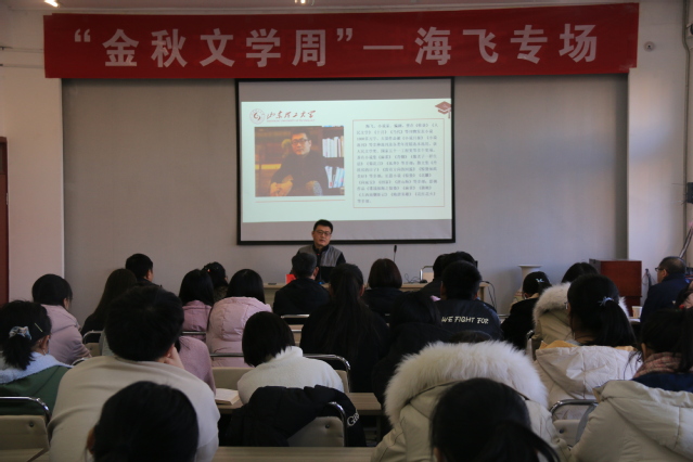 (本站讯)12月3日下午,“金秋文学周”——海飞专场讲座在西校区2号教学楼210教室举行。此次讲座由中国作家协会会员、国家一级作家海飞主讲,淄博市作家代表、bevictor1946韦德官网师生代表参加。