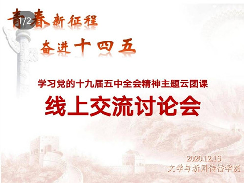 而后,全媒体中心负责人孙熙悦进行发言。她说到,实现中国梦,必然是物质文明和精神文明比翼双飞的发展过程。通过五中精神云团课的学习,她认识到,自党的十八大以来,以习近平同志为核心的党中央高度重视文化建设,突出强调增强中国特色社会主义文化自信,把坚持马克思主义在意识形态领域指导地位的制度确立为中国特色社会主义的一项根本制度,把坚持社会主义核心价值体系纳入新时代坚持和发展中国特色社会主义的基本方略。紧接着,各年级团支书认真学习团课,积极发表看法。他们表示,十九届五中全会精神能反映中国人民在中国共产党的领导下享有美好生活,走进新时代的美好愿景。最后,各团支书通过腾讯会议聊天的形式发送其感悟,并由曲慧进行会议总结。此次线上会议到此顺利结束。