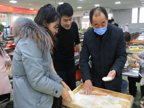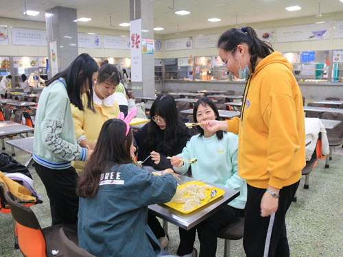 活动伊始,餐厅服务人员为同学们分发所需工具和备用物品,以四人一组安排桌椅,并摆放音响等相关设备。之后,同学们以小组为单位进行活动,共同分配任务,准备活动事项。同学们积极对待此次活动,热情高涨。张成宝亲自示范指导,现场同学认真观摩学习。任纪帆参与小组活动并与同学们亲切交流,认真指导活动进展。而后,在同学们的不懈努力下,“包饺子,过冬至”活动成果初见成效,盘盘水饺外形美观。同学们完成初期工作后在指定地点有序排队等待水饺煮熟,端回原处共同分享劳动成果。最后,任纪帆向部分同学分发零食、糕点,奖励其在活动中取得的好成绩,并与他们共同品尝水饺,拍照留念。同时,同学之间相互交换品尝,交流参与此次活动的感受和体会,现场气氛融洽。此次“包饺子,过冬至”活动顺利结束。