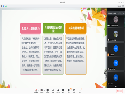 竞选秉承公平、公开、公正的原则,分为限时演讲、评委提问以及商讨三个环节。活动伊始,赵小淇公布抽签顺序并简单介绍活动流程,每位竞选者按顺序进行5分钟限时演讲并进行PPT展示,分别就“个人介绍”“对岗位的认识”“社联存在的问题”“工作设想”等方面表达自己的观点。于璐讲到,自身有丰富的工作经历,无论是在员工会还是在社会实践团中,自己的工作能力、人际交往能力都得到很大提升。她提出,目前社联存在官方账号利用率低的问题,其能够利用自身在新媒体方面的优势来加强社团的影响力和知名度。之后,丁洁讲到,自己之前虽然没有在社联任职,但前期已充分了解社联,社联存在内部管理机制不健全、社团氛围不活跃、知名度低、宣传不到位、社团数量多而不精等问题,就这些问题她提出相应解决措施。同时,她提到要联合员工会等部门对社联骨干进行培训,通过纳新为社团注入新活力等想法。而后,韩雨提到,要加强社联影响力,推出品牌活动提高活动质量,注重团队内部建设,加强沟通交流、增强联系。最后,竞选评委进行打分,此次换届竞选活动顺利结束。