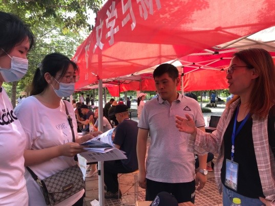 2021年6月30日上午,李晓伟、王庆起、任纪帆三位老师参加胶州招生咨询会进行定点宣传,同时也积极联系所负责片区的公司,将招生宣传材料交给公司,由公司有针对性地转发给毕业班员工,并寻求与对方对接建立起长期合作关系。