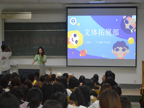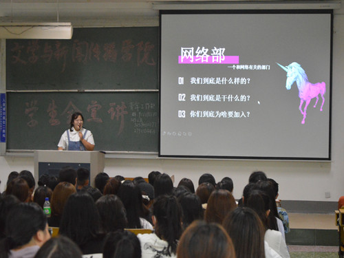 各部门负责人以内容精美、形式多样的ppt搭配简洁大方、生动活泼的语言,向在场新生展示其部门精彩非凡的工作成果和温馨欢乐的工作氛围。青年工作部提出他们的希望,要对工作耐心细心,责任心强,有团队合作意识及较好的沟通能力;网络部则表示,部门拍摄的每一张照片,记录的每一段文字,制作的每一张海报和每一段视频,都是因为生活可爱且值得。加入网络部,让你在这个满是喧嚣的世界里,活的很酷:新媒体部分享部员集体为部门庆生的温馨瞬间;学风建设部则展示由其举办的文院四大经典活动,阅读经典、金秋文学周、考研帮帮团以及驻校作家进校园;易班工作站还通过抽奖的形式,将现场气氛推至高潮。活动在轻松活跃的氛围中顺利结束。