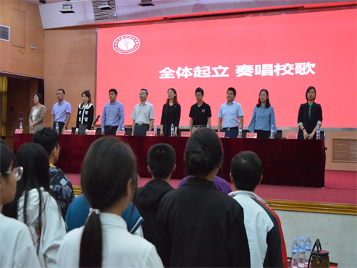 新生领誓人张嘉栋带领全体员工庄严宣誓。同学们目光坚定,声音洪亮。宣誓完毕,全体同学齐唱校歌《你伴随我》,同学们脸上洋溢着对未来的无限憧憬。