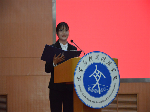 新生代表田芳铭代表全体新生发言,表示将厚植爱国主义情怀,谨遵“厚德、博学、笃行、至善”的校训,牢记“谦谦君子,温润如玉”院训,秉承文苑优良传统与学风,勤奋好学,提升自我,争当全面发展的“五有人才”。
