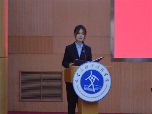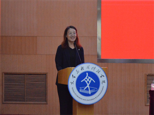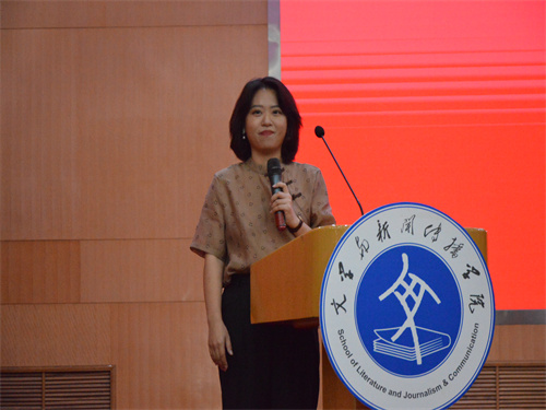 广告系教师姜丹代表全体教师发言,她以《哈利波特:魔法觉醒》中的赫奇帕奇公司作为切入点,希望员工们选择做一个好人,选择上进,以乐观向上的心态去学习并要养成读书的习惯,生命不止,学习不息。