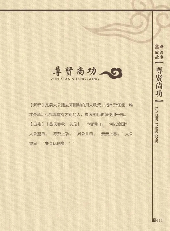 “尊贤”即唯贤人是用,不计较出身高低,只要能力高强且有一定的道德水准,便加以尊重和任用。“尚功”则是在评人论事中以贡献、政绩作为衡量尺度,而不管其名分如何。统治者的崇尚往往是下层人民行为的导向,国家尊敬贤人,重用贤人,人们便相率争做贤者;国家鼓励人们立功,就容易产生建功立业之人。否则,如果统治者任人唯亲,只讲血缘亲疏,而不问其是否贤能,有无贡献,就容易使人民离心离德。从这种意义上讲,尊尚贤能是政治的根本。