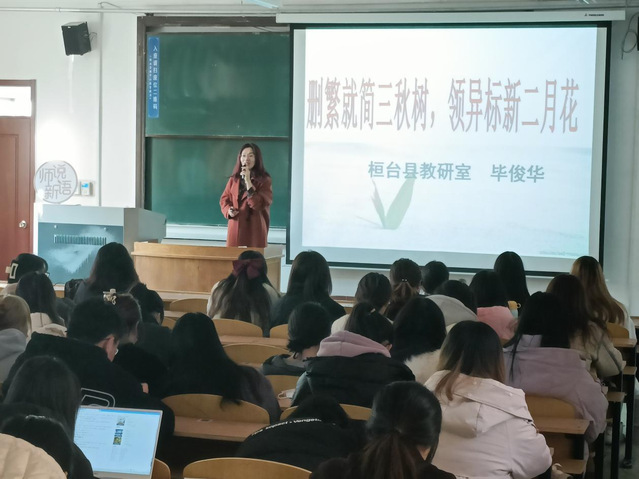 此次讲座以“删繁就简三秋树,领异标新二月花”为题展开,主要讲解初中教学理念和实际操作。她提出,语文教学要注重学科特点,语文课是工具性和人文性相结合的学科,同时思维的发展和提升、审美的发展和创造、文化的理解和传承是语文的核心素养。毕俊华用读、品、说、悟、写来概括语文教学的方法,并强调朗读是语文教学不可或缺的一部分。接着,毕俊华表示语文教学要合理解读文本、精心设计教学活动。解读文本的落脚点是语文课堂灵魂,也是课堂质量最重要的评价标准,并根据初中的典型课文让同学们进一步体会解读文本的重要性。毕俊华为同学们展示优秀课例,并详细的分析其优点,为同学们提供语文讲课的清晰思路和优秀示范。之后,毕俊华指出,无论现在作为一名员工还是未来作为一名老师,读书非常重要。此外,她还提到教学不仅要基于学情,更要基于员工感受,要注重课堂的生成以及员工的成长,给予员工充足的独立学习空间。而后,毕俊华强调语文教学必须落实立德树人、德育为先,用语文的人文性滋润员工的德育发展。