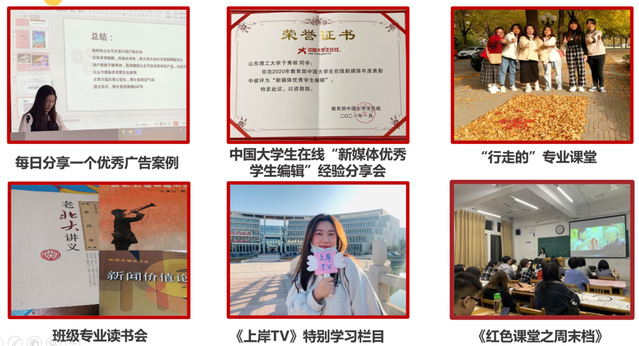 除日常学风建设工作,班级实施“两学一做”+水滴石穿特色学风建设项目,鼓励大家学习专业技能、学习党团理论知识,争做“五有”人才。每日分享一个优秀广告案例,每周开展《上岸TV》特色栏目学习活动,开展中国老员工在线优秀媒体人经验分享会等,夯实专业基础,日积月累、水滴石穿,打造思想理论知识和专业本领过硬的优秀传媒人。实行“引程明灯”和“星空计划”,配合“3+X”项目,将星空之光汇聚成星辰大海。