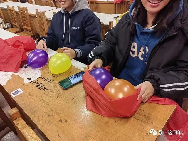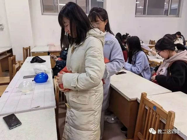 图片    随着胎儿的生长,妈妈们的身体也有着各种各样的变化:水肿、进食后的反流、呼吸困难、耻骨疼痛,以及强烈的下坠感。为了让同学们更直观地体会到怀孕的感觉,在这次的主题班会中,同学们绑上了注水气球。